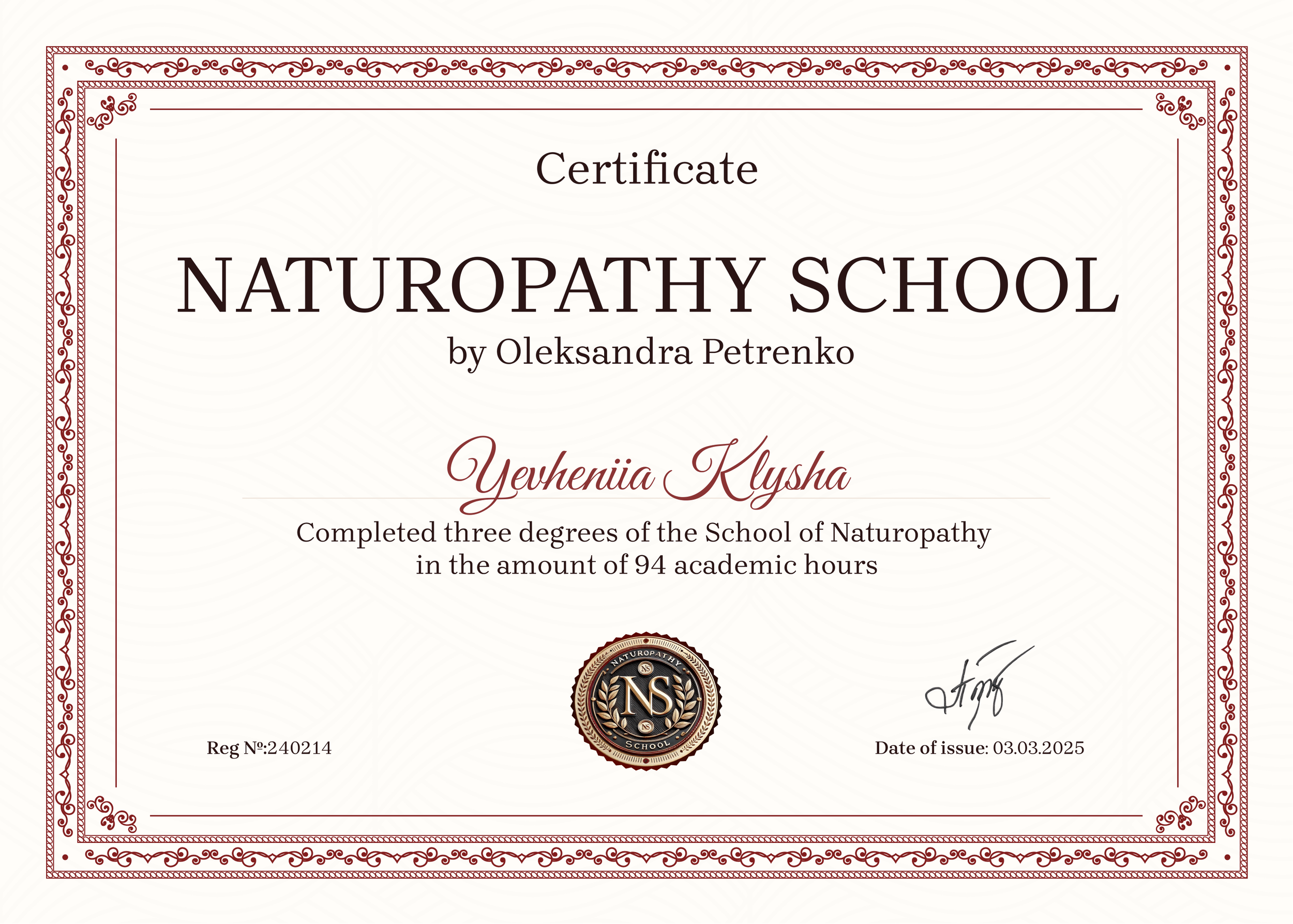 Маю щиру любов до аюрведи, ефірних олій, йоги, медитацій, пошуку та дослідження світу. Завжди говорю із підопічними про важливість дихальних вправ (працюють доказово). Але основа моєї роботи — доказові принципи (основи анатомії, фізіології, біохімії, Гарвардська тарілка, останні дослідження мікробіому і т.д). Тут не буде місця гомеопатії, кето, дієтам на 1200ккал, безвуглеводним типам харчування.